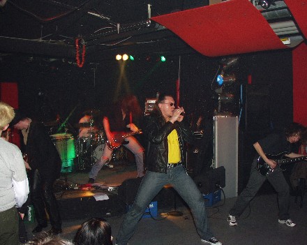 Mit hochgezogenen Augenbrauen beobachteten die Anwesenden nach der ersten Vorgruppe "Milk", was sich anschließend auf der Bühne abspielte...ein aufgeblasener Gockel stolzierte während der Umbauarbeiten auf der Bühne herum. Es war der Sänger von M.A.D. Er trug eine speckige Lederjacke, arschlange Haare, Sonnenbrille und Bierbauch. Sexüüüüü Die fragenden Blicke der Zuschauer verwandelten sich bei den ersten Tönen entweder in ein ungläubiges Grinsen oder in nacktes Entsetzen..einige ergriffen die Flucht... Der AD/DC-Verschnitt krächzte und kreischte in den höchsten Tönen...wären Fensterscheiben in dem Raum gewesen, wären sie wohl in tausend Stücke zersprungen . Aber der Typ war so schräg und lächerlich, dass es schon wieder schön war... .