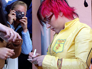 Erst hat Daniel geprobt und dann kam die Elli, verschlafen, mit Zigarette in der Hand... alle haben ein Autogramm bekommen, nur ich nicht *heul* demnächst werd ich auch mal so aufdringlich sein wie andere Leute zumindest hat sie meine Brille begutachtet und gesagt: "coole Brille" und ich so: "Danke, gleichfalls..." *stääärb* dann musste sie zur Probe, und das gleich zweimal. Dann wieder zwei, drei Autogramme (wieder keins für mich) und dann ab in die Maske. Nur so nebenbei: Sie war zu JEDEM freundlich und hat gegrinst, auch wenn sie wahrscheinlich lieber ins Bett gegangen wäre!