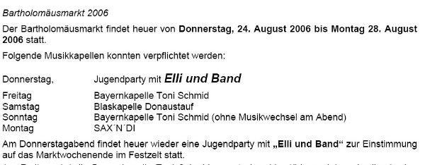 AUFHAUSEN (lms). Es ist wieder soweit: In Aufhausen steht die fünfte Jahreszeit vor der Tür – und das ist hier nicht der Fasching, sondern der Bartholomä-Markt. Morgen geht´s los! Diesmal sind „Superstar“ Elli , aber leider nicht Vizekanzler Franz Müntefering mit dabei. „Münte“ musst in letzter Minute absagen. Für ihn kommt Staatsminister für Europaangelegenheiten im Auswärtigen Amt, Günter Gloser.